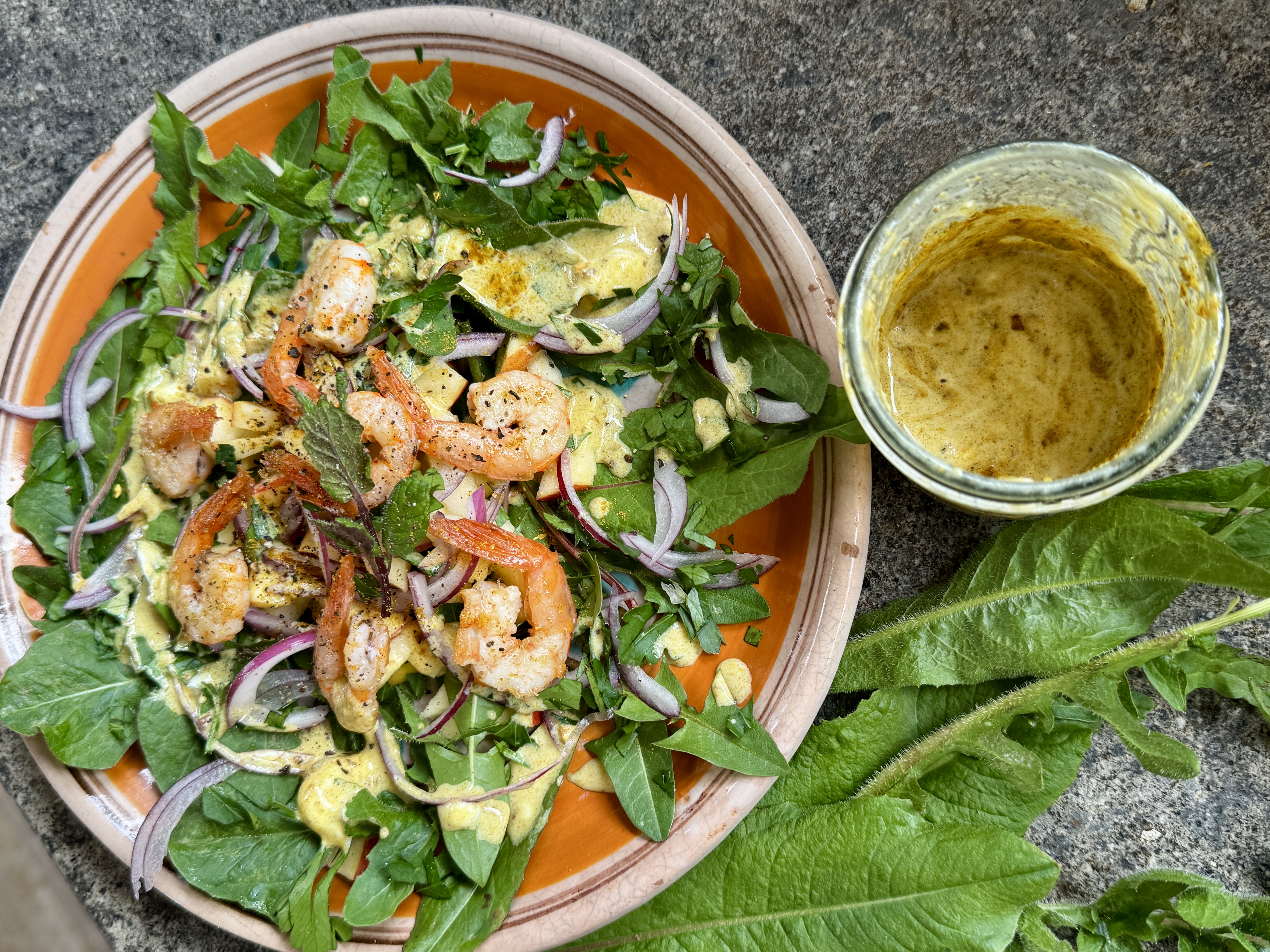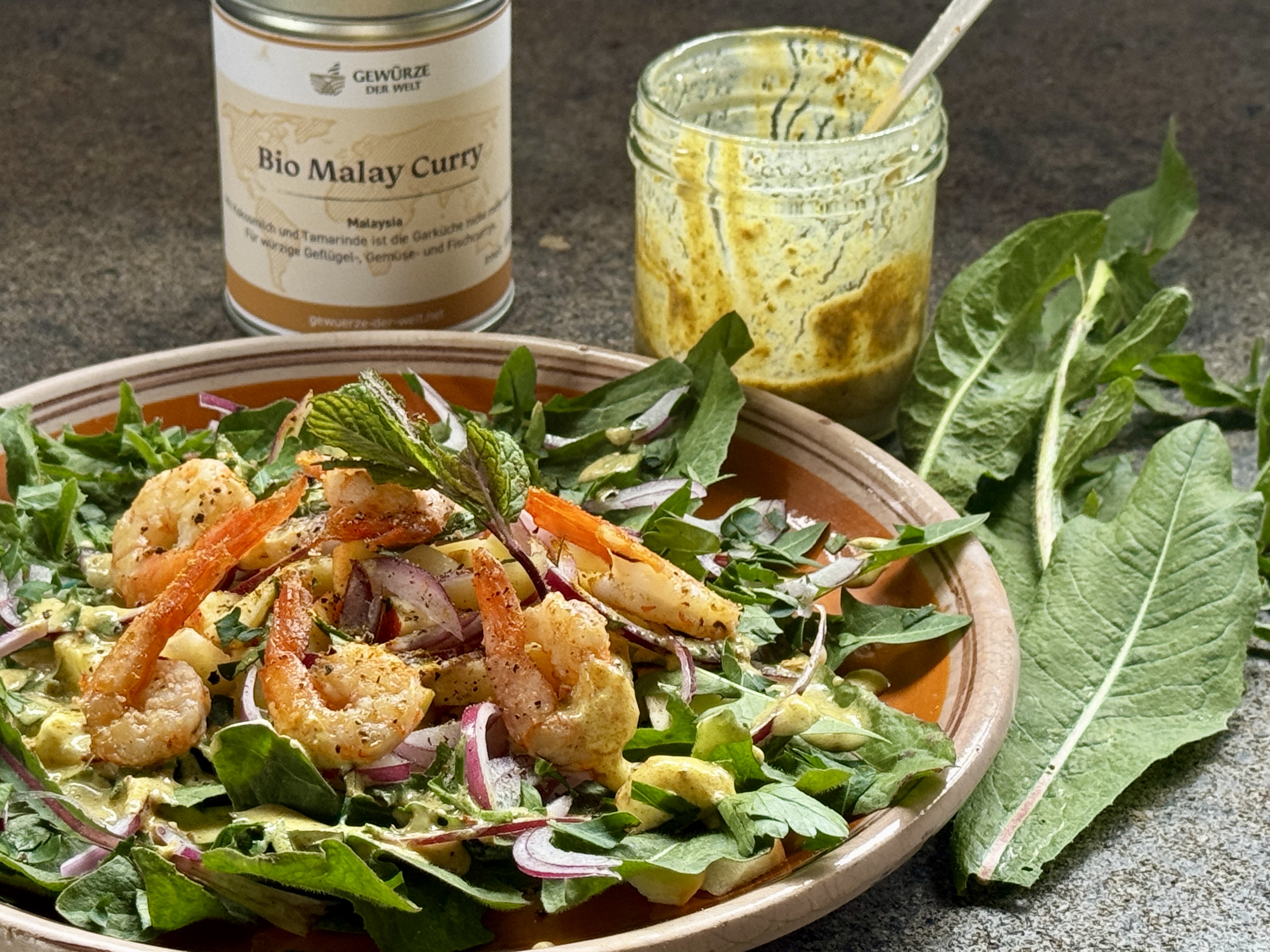 Der Salat verträgt gut eine Handvoll Wildsalate, die könnt ihr auch perfekt mit herkömmlichen Salaten mischen! Besonders gut sind ein paar junge Löwenzahnblätter zusammen mit Zichorie. Da bekommt ihr ein paar gesunde Bitterstoffe auf den Teller, die dem Salat dank des intensiven Curry-Dressings aromatisch sehr gut stehen…