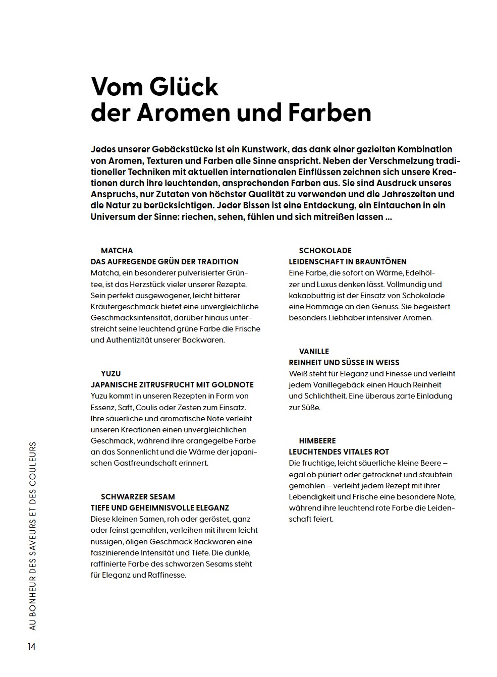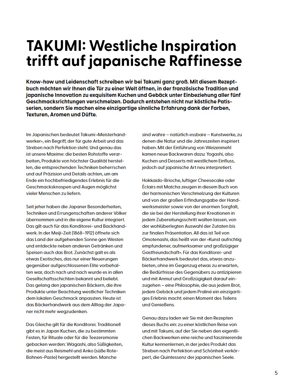 - Insgesamt enthält es 80 Rezepte, welche die Raffinesse japanischer Kreationen mit außergewöhnlichen Produkten (Yuzu, Vanille, Matcha, schwarzer Sesam...) zu einer großen Palette an Geschmacksrichtungen verbinden.