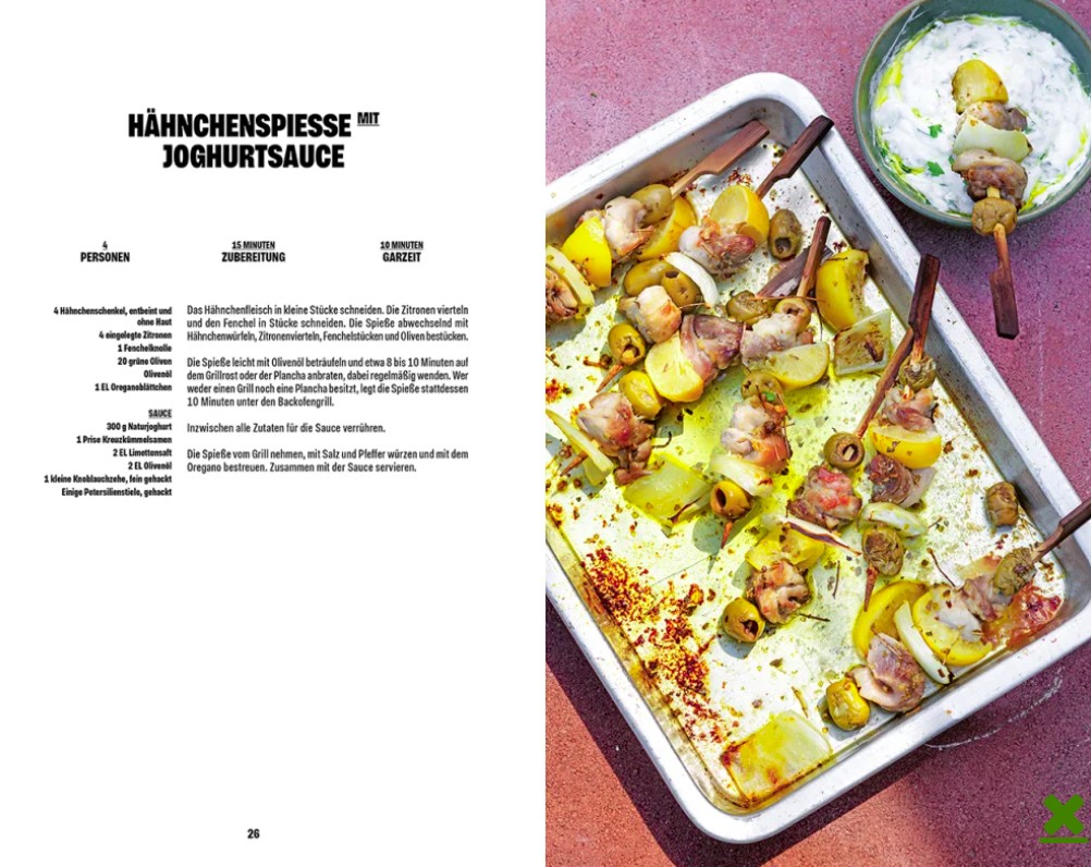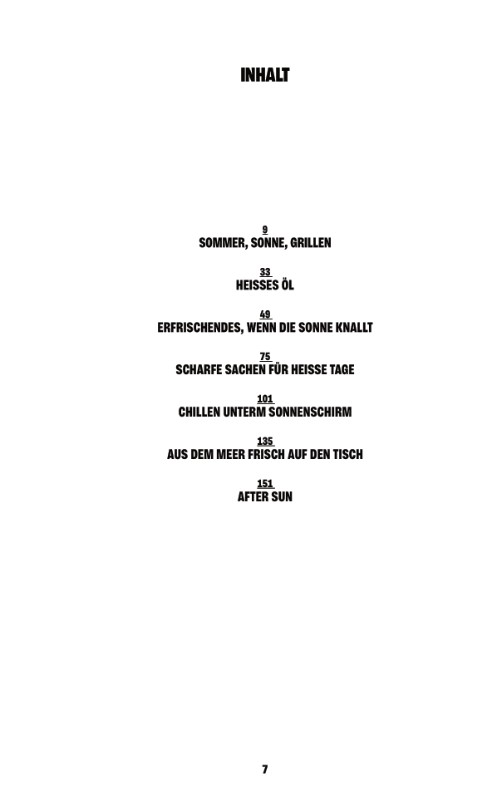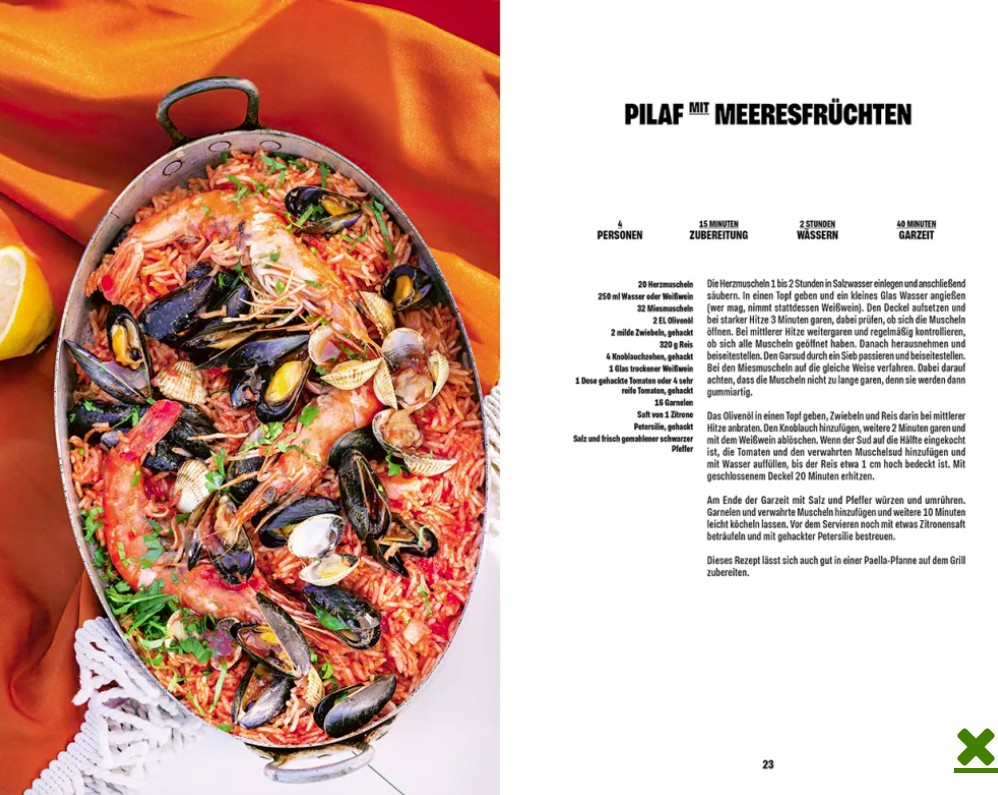 Alle Rezepte für den Sommer sind auf einfache Küche und kurze Zubereitungszeiten ausgelegt. Du findest erfrischende Ideen wie Wassermelonen-Tomaten-Gazpacho, blitzschnelle Salate oder leichte Kombinationen wie Fenchel mit Stracciatella und Granatapfel. Mediterrane Rezepte wie gegrillte Dorade mit Zitrone, Gambas in Pastis oder Linguine mit Venusmuscheln bringen Urlaubsgefühl auf den Teller. Ergänzt wird das Sommerkochbuch durch BBQ-Rezepte und kleine Gerichte zum Teilen – perfekt für jede Sommerparty. Und wenn die Hitze am größten ist, sorgen leichte Desserts wie Zitroneneis am Stiel, Aperol-Spritz-Granita oder Joghurteis für wohltuende Erfrischung.