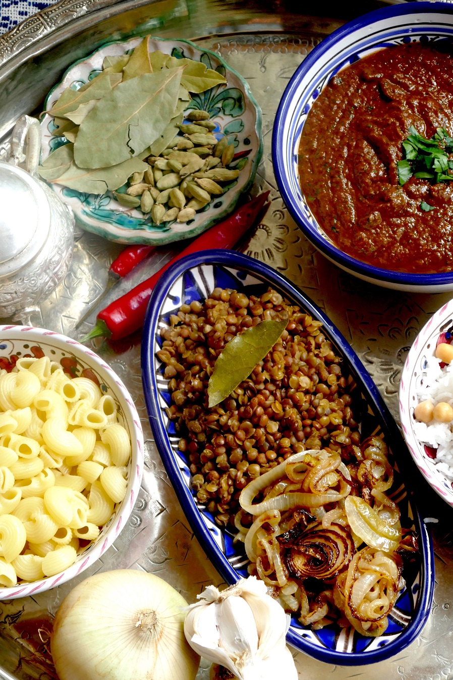 Zum Servieren Reis, Linsen und Makkaroni in Schälchen schichten. Die Sauce und die Zwiebelringe darauf verteilen.