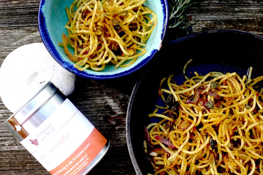 Was machen mit den restlichen Spaghetti vom Vortag? Als Kind schon habe ich „alte“, gebratene Nudeln geliebt, sie werden so herrlich knusprig! Gewürzt mit unserem Zitronenpfeffer, Rosmarin und gehackten Kapern kann sich dieses Resteessen auf jeden Fall schmecken lassen!