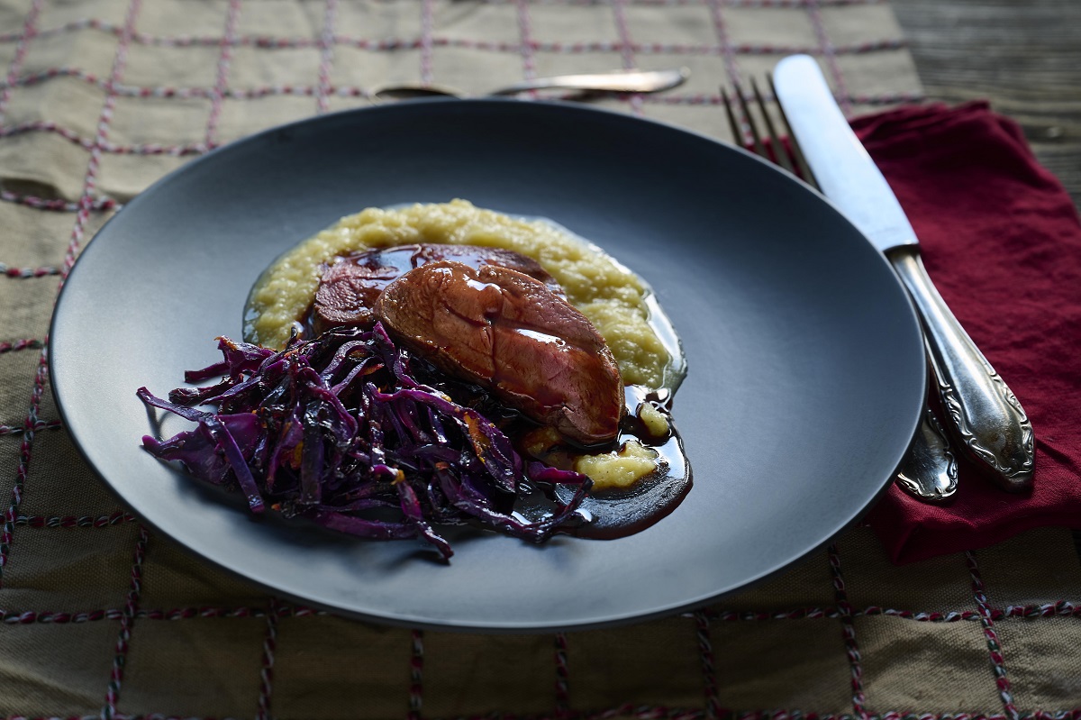 Rosa Rehkeule mit gebratenem Rotkohl und Kartoffelpüree