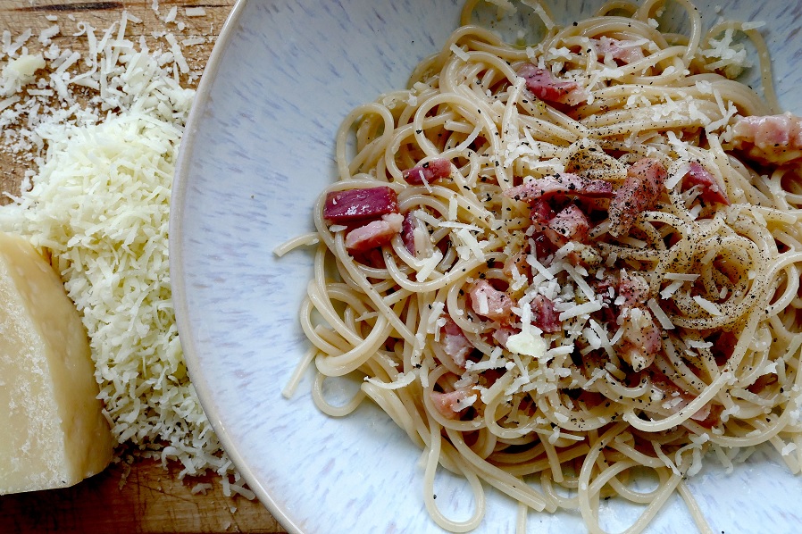 Carbonara vergesse ich immer wieder und bin jedes Mal überrascht, wie köstlich dieses einfache Gericht ist. Und das mit so wenigen Zutaten! Wer also das Glück hat, noch Pasta zu besitzen: Ran an den Herd! Wer es „gelber“ mag kann noch ein zusätzliches Eigelb in die Ei-Käsemischung geben.