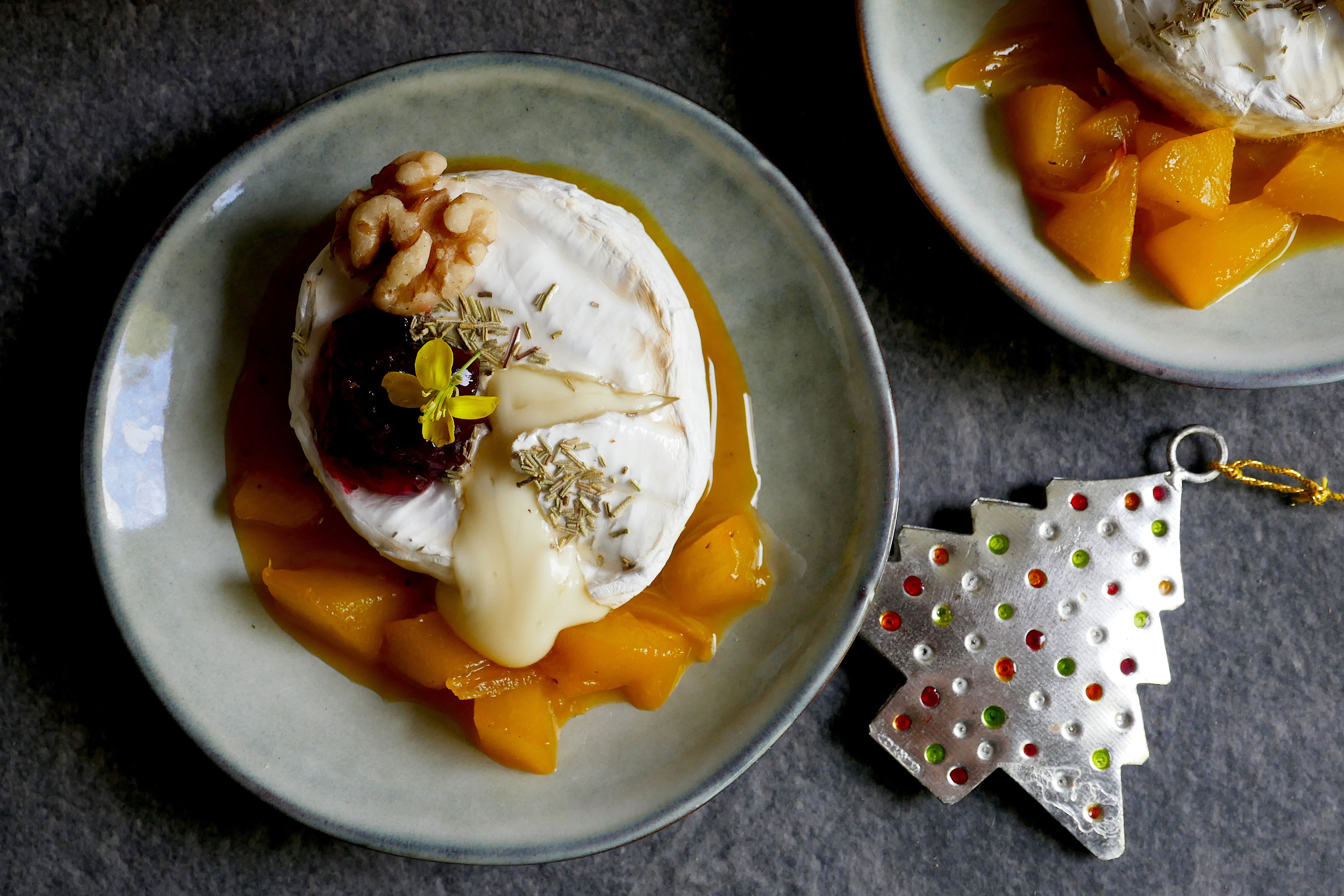 Vorspeise: Gebackener Camembert mit Safran-Birnen-Chutney (Zubereitungszeit: 10 min, Kochzeit: 30 min)