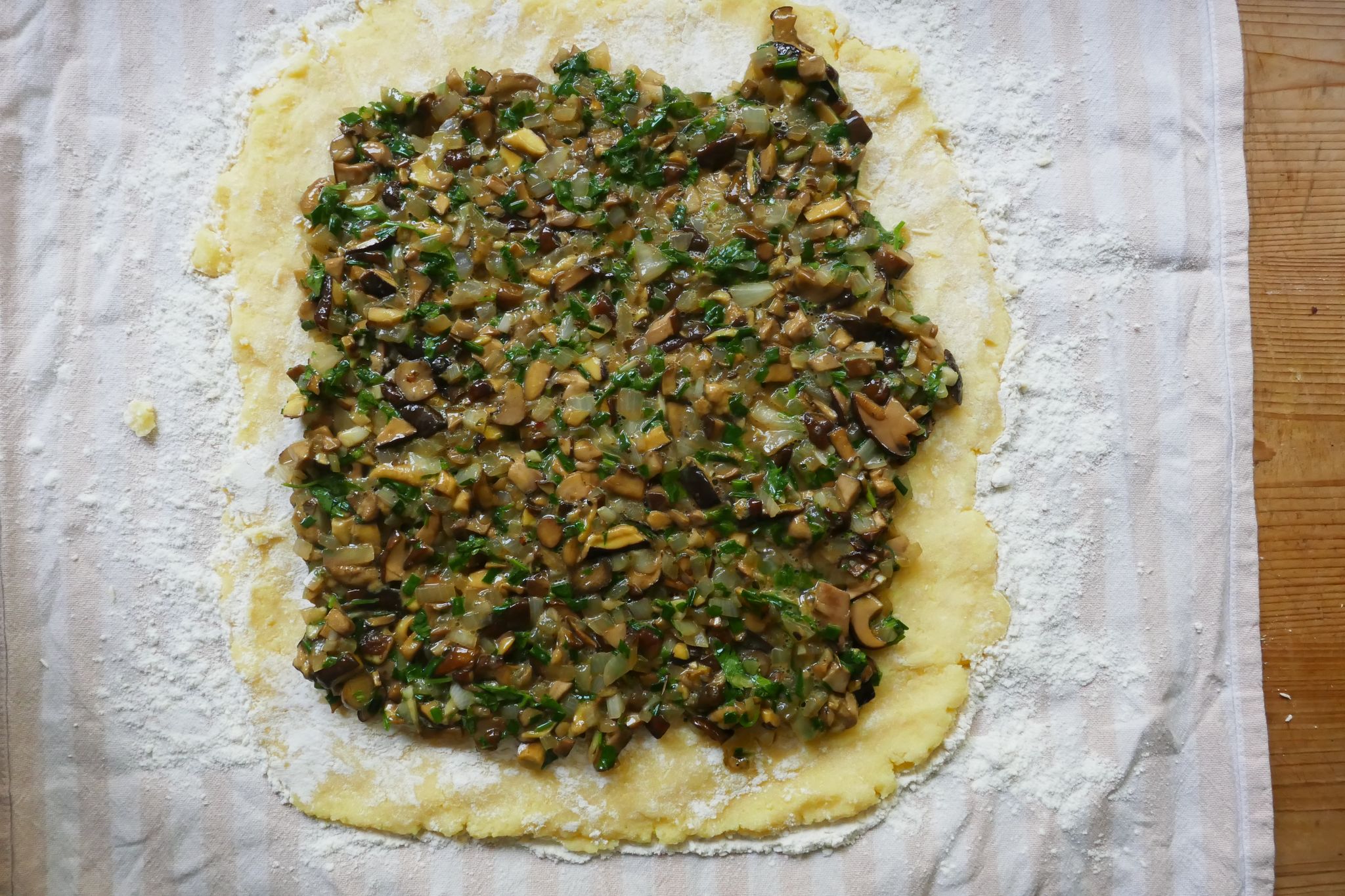 Die Pilze putzen und in kleine, dünne Scheiben schneiden. 2 EL Öl und 1 EL (~10 g) Butter in einer großen Pfanne erhitzen. Die Pilze darin anbraten. Zwiebel und Knoblauch zufügen und 2-3 Minuten weiter braten. Vom Herd ziehen, mit Steinpilzpulver, Salz und Pfeffer würzen und abkühlen lassen. 1 Ei und Kräuter untermischen.