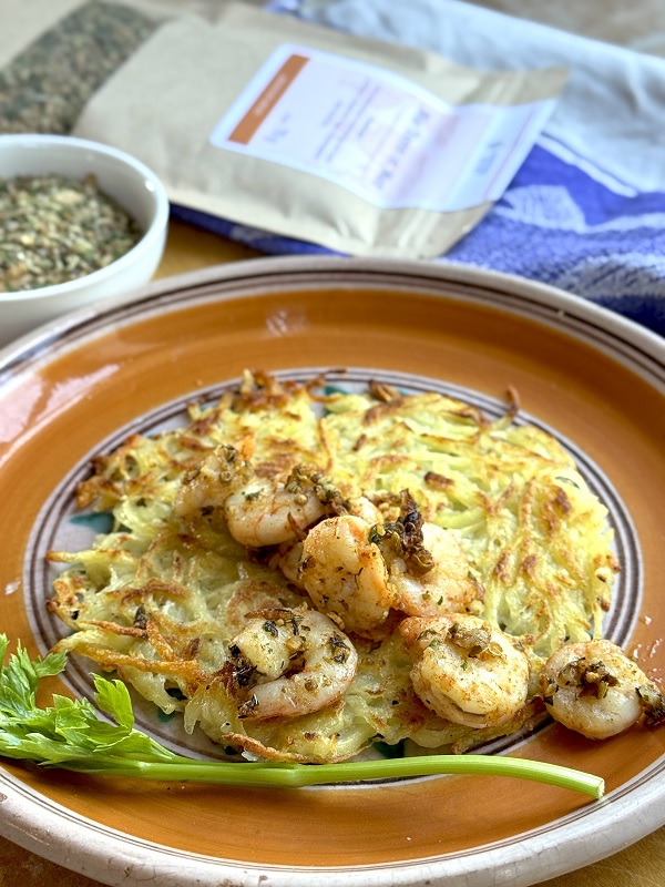 Reiberdatschi können auch französisch! Hier toppen wir sie mit Knobi-Garnelen, die mit unserer neuen, hausgemachten Gewürzmischung Bio Terre et Mer die Aromen des französischen Sommers auf den Teller zaubern…