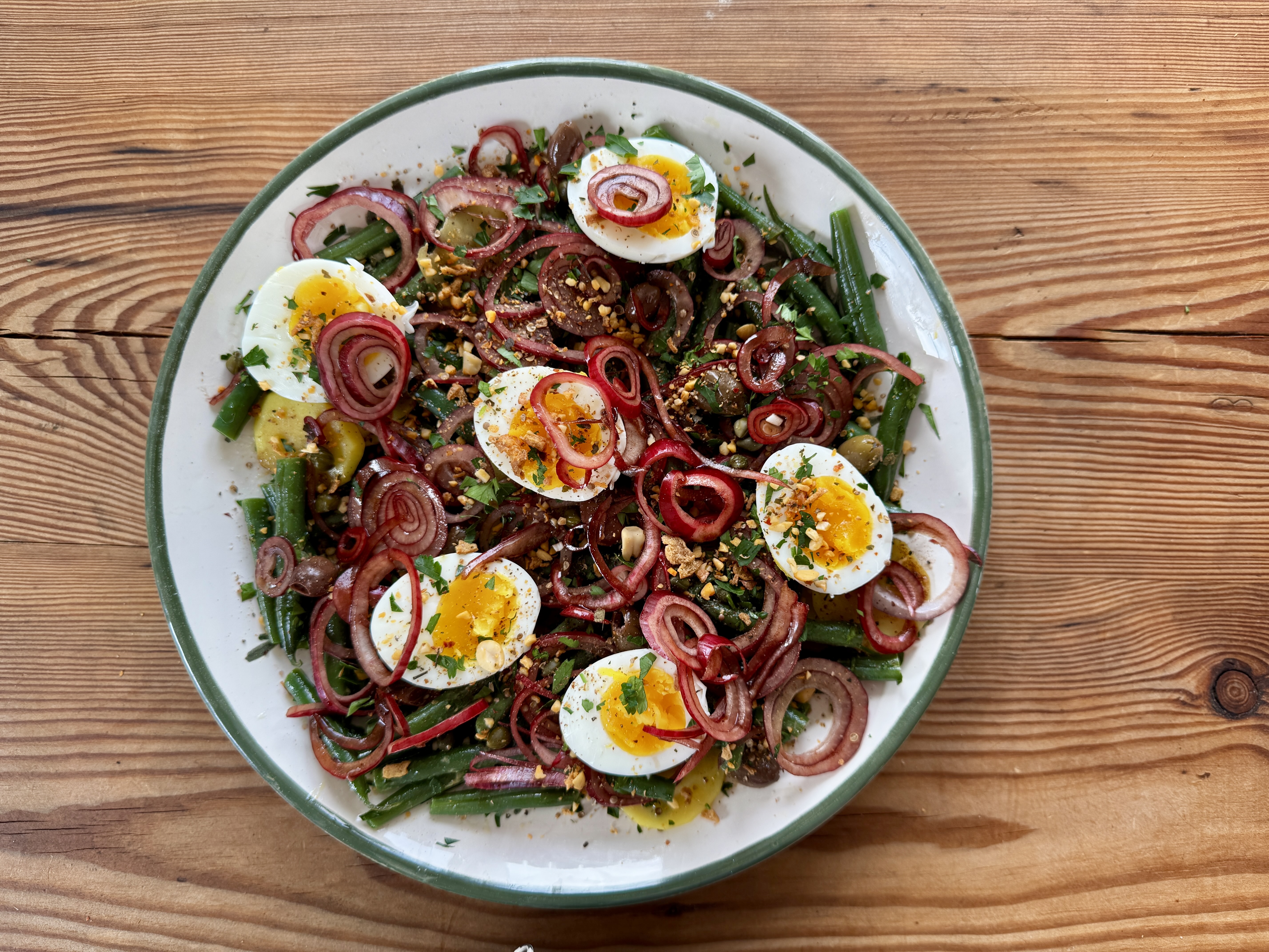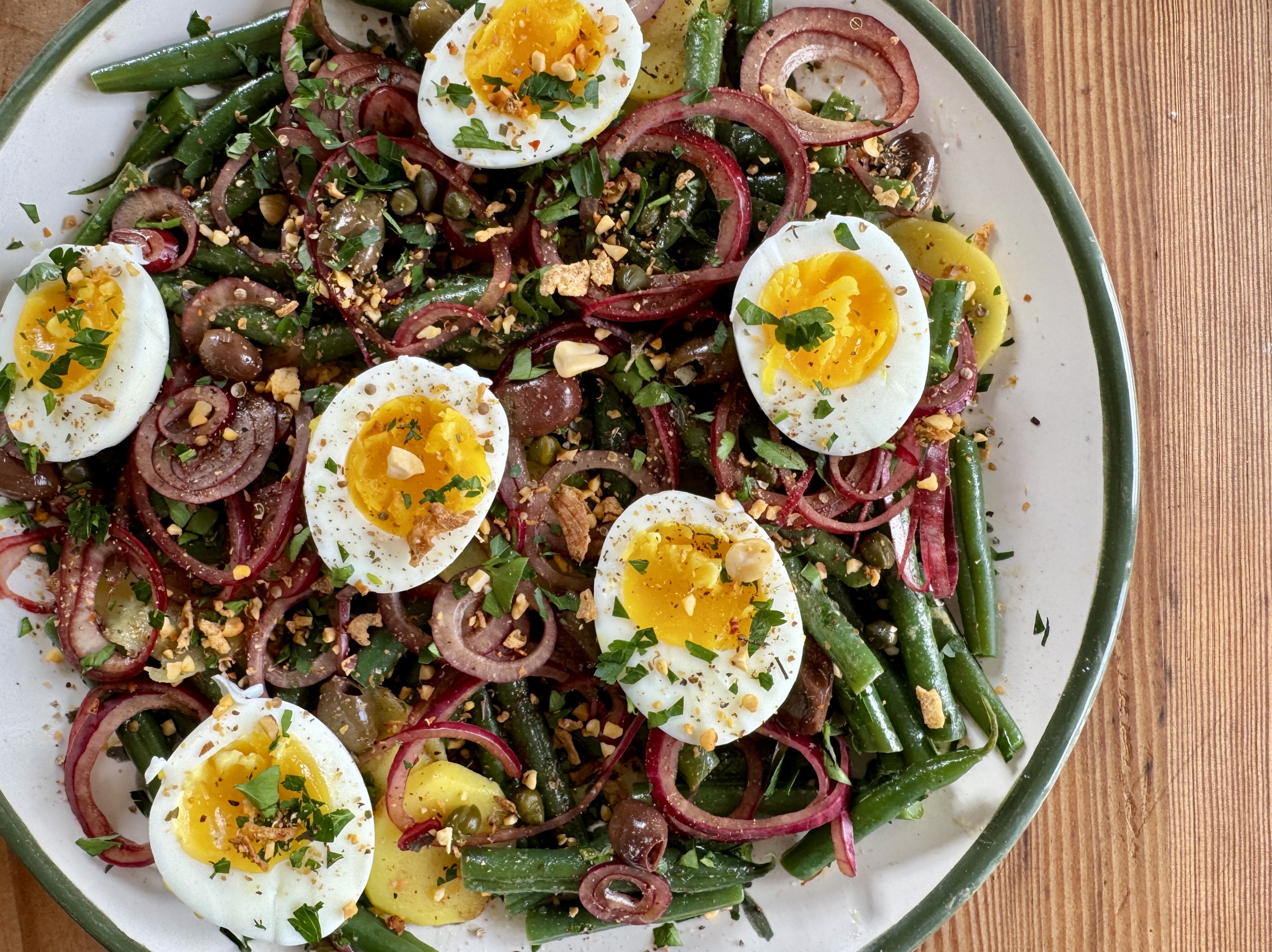 Zum Servieren den Bohnen-Kartoffel Salat auf einer Platte anrichten und mit Eiern, Oliven sowie den marinierten Zwiebelringen garnieren. Reichlich mit Curryblätter-Dukkah bestreuen.