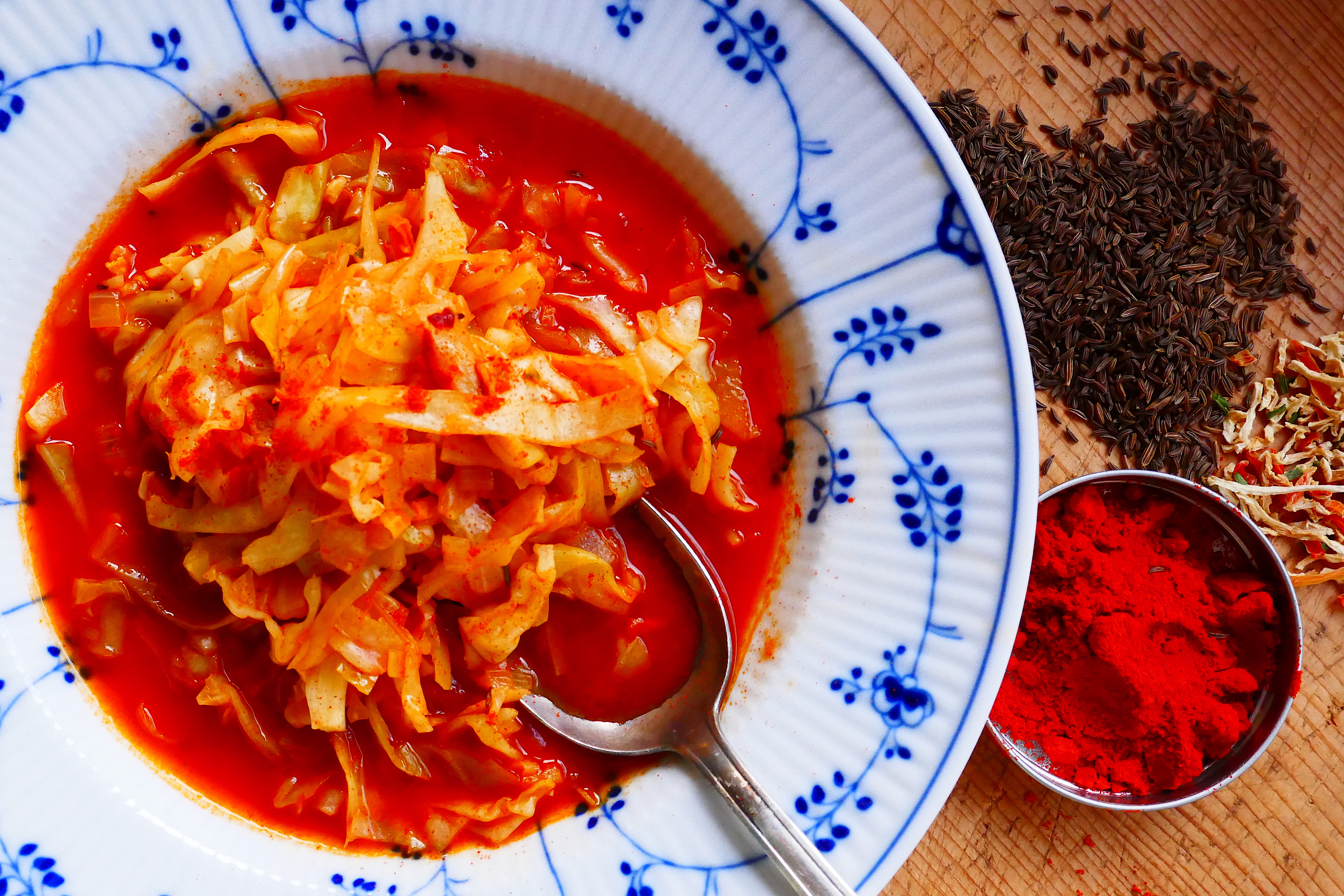 Paprikapulver und Suppengewürz Julienne einrühren und mit Wasser auffüllen, so dass das Kraut bedeckt ist. Zugedeckt garen, bis das Kraut weich ist.