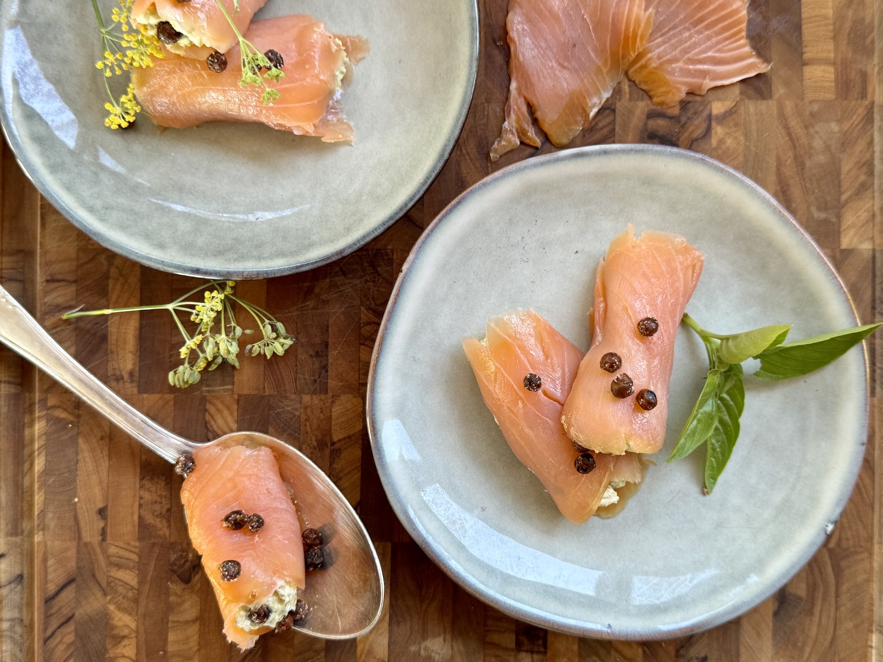 Die Lachsröllchen auf der Platte anrichten und großzügig mit fermentiertem Pfeffer garnieren.