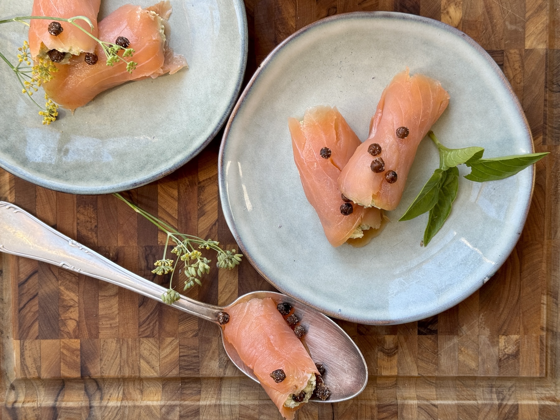 Die Creme auf die Lachsscheiben streichen und diese vorsichtig aufrollen.