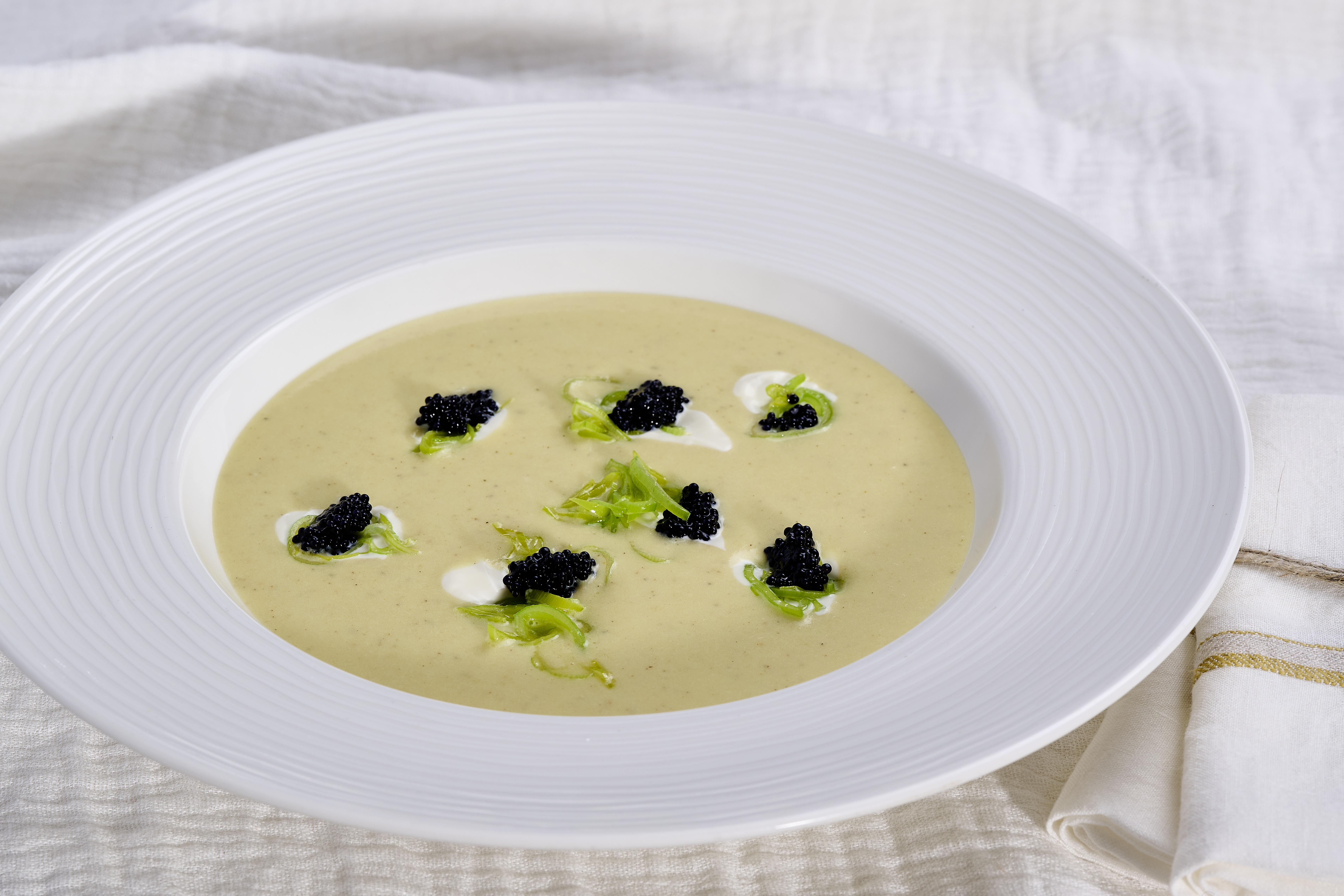 Vichyssoise ist eine klassische französische Lauch-Kartoffel-Suppe, die normalerweise kalt serviert wird. Sie besticht durch ihre samtige Textur und ihren mild-cremigen Geschmack aus Lauch, Kartoffeln und Sahne – oft elegant verfeinert mit feinen Gewürzen oder edlen Zutaten wie Kaviar.