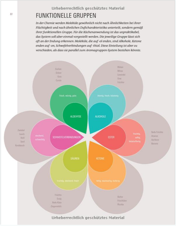 Ein einzigartiges Farbleitsystem teilt die acht Aromenklassen in Farben ein: Gleiche Farben harmonisieren, unterschiedliche liefern Ergänzungen. Innovative Schaubilder machen wissenschaftliche Erklärungen leicht verständlich. Chili passt zu Vanille, Lavendel zu Basilikum und Sojasauce zu Erdbeeren. Endlich wird klar, wieso der wunderbar blumige, leicht zitrusartige Geruch der Nori-Algen verschwindet, wenn sie gekocht werden.