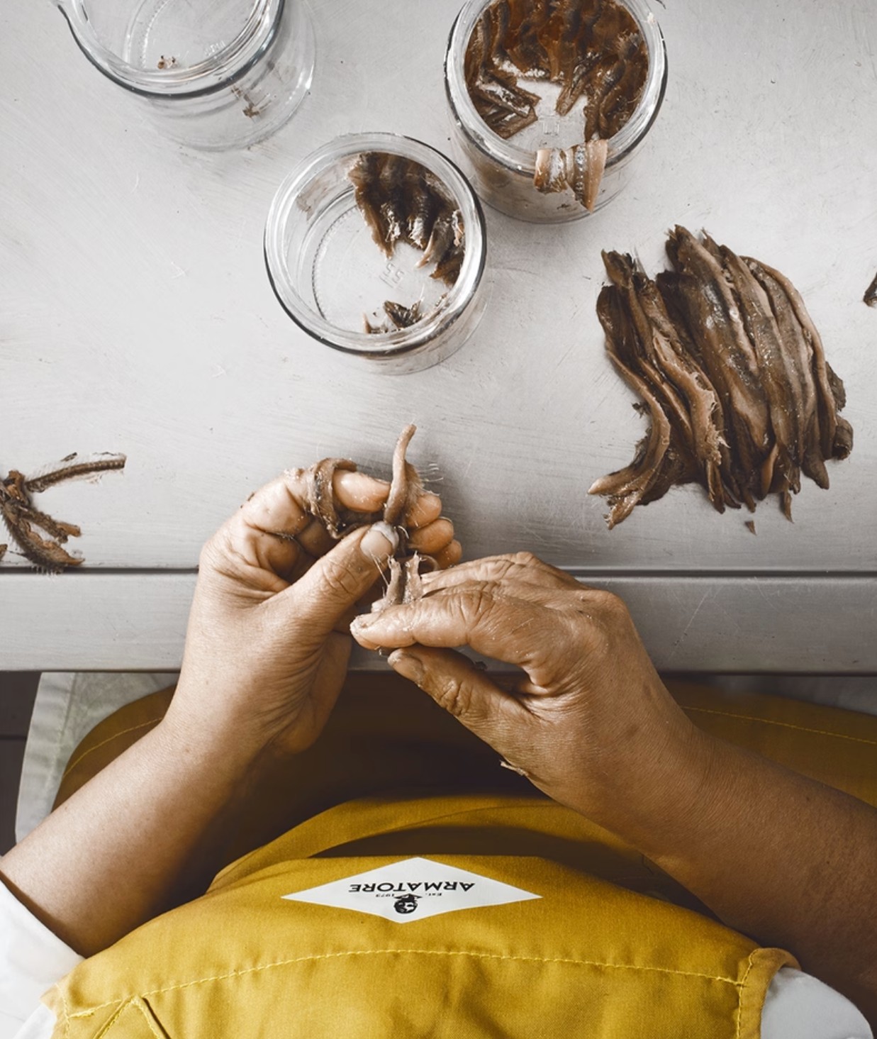 Nach der Reifung werden die Sardellen von Hand vom Salz befreit und gereinigt, filetiert und in hochwertigem Olivenöl eingelegt, wodurch ihr feines Aroma und ihre kompromisslose Qualität erhalten bleiben.