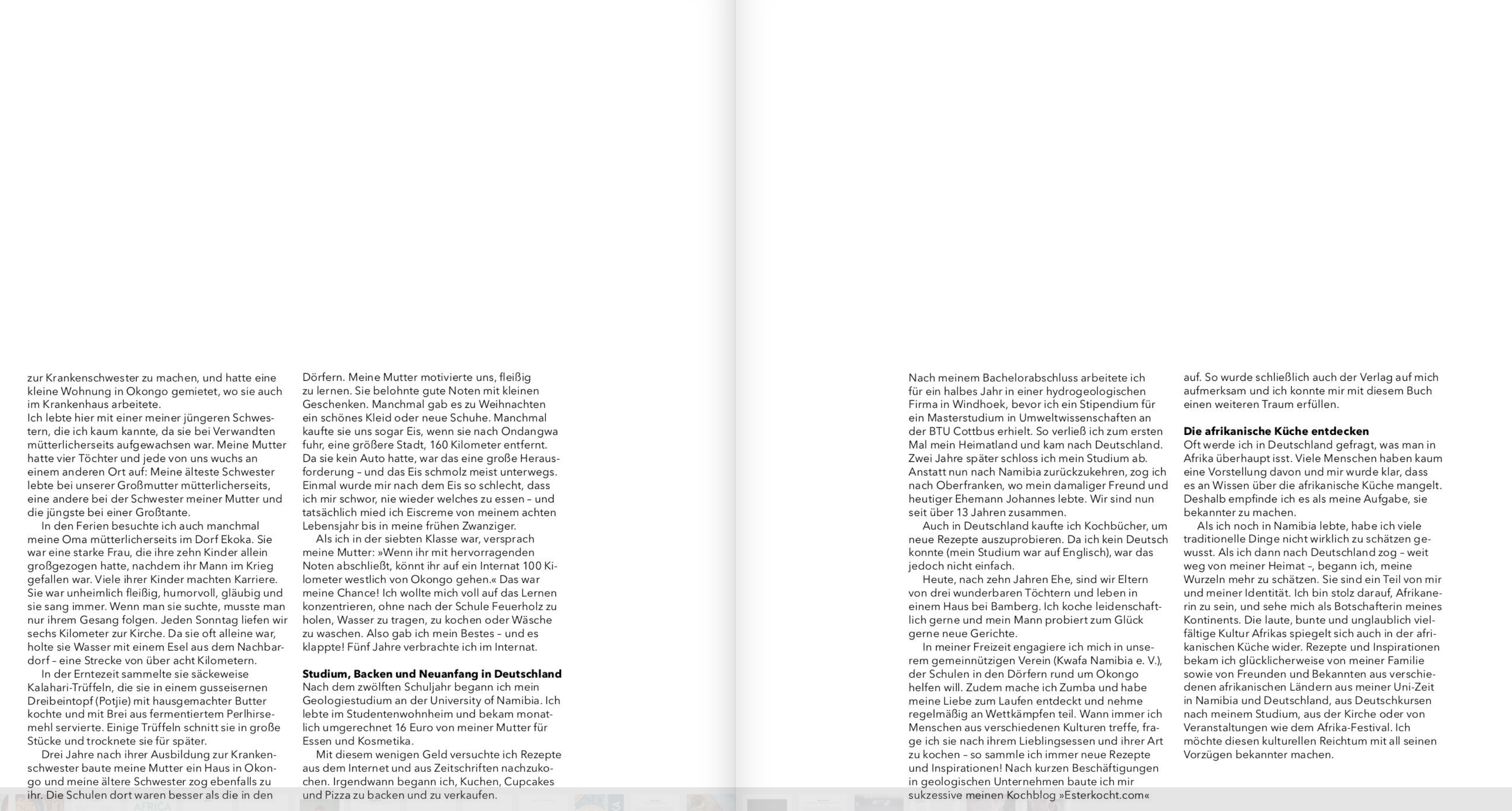 - Ester Laub, in Namibia geboren und heute in Oberfranken lebend, gründete 2018 den Foodblog »Ester kocht«, um Familienrezepte zu teilen und die namibische Küche bekannt zu machen.