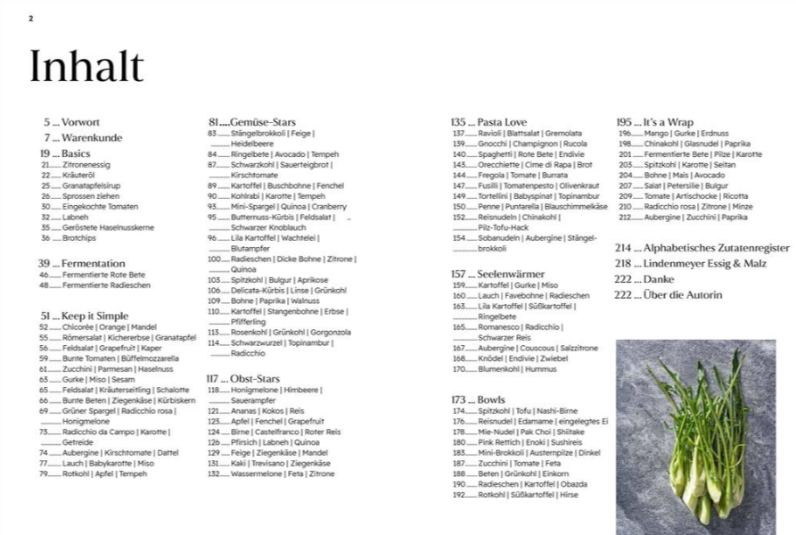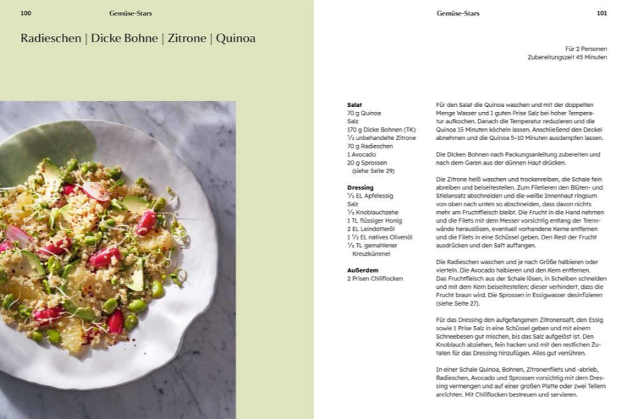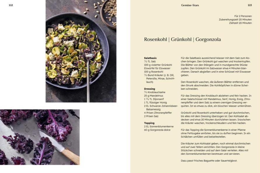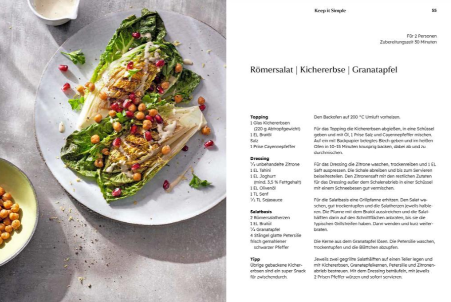 - Die Autorin kombiniert frische Zutaten zu modernen Gerichten wie gegrilltem Römersalat mit Tahini-Joghurt-Dressing oder Hirse-Bowls mit orientalischem Rotkohl.