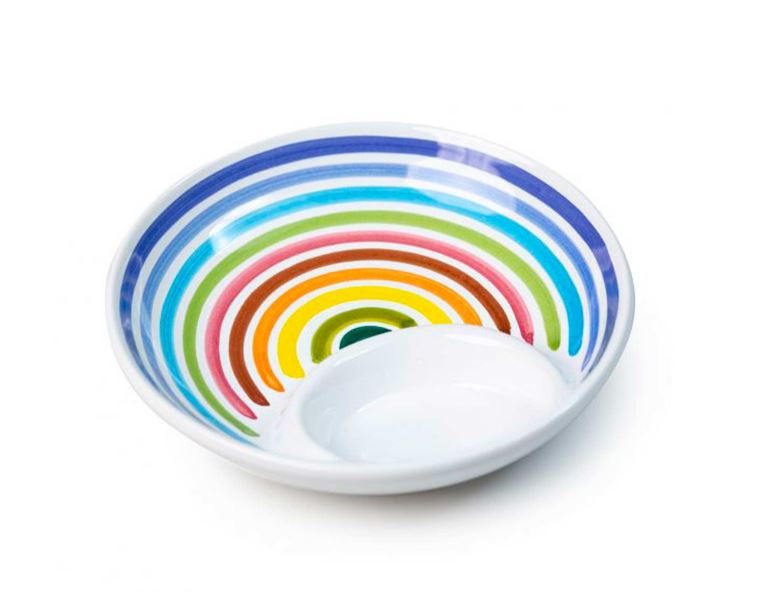- Von apulischen Töpfermeistern von Hand bemalte Keramikteller mit dem Regenbogenmotiv, das dem der Designerflaschen nachempfunden ist. Durchmesser 15 cm.